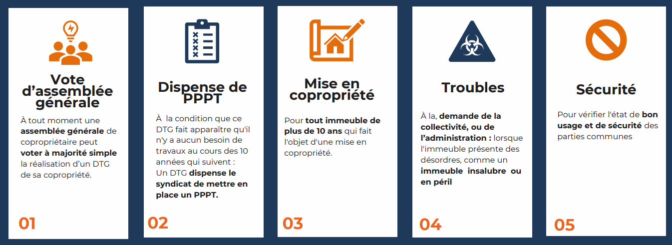 • L’administration peut demandé la présentation d’un DTG/PPPT (lorsqu’une procédure d’insalubrité est initiée par exemple). En cas de non présentation, celle-ci peut exigé de la copropriété la réalisation d’un DTG.
